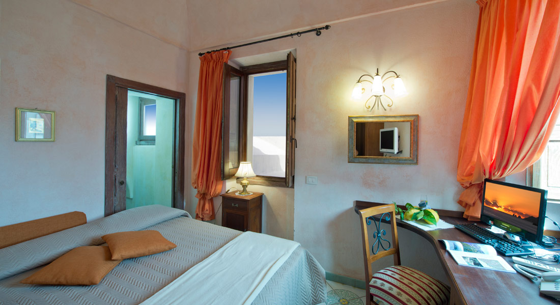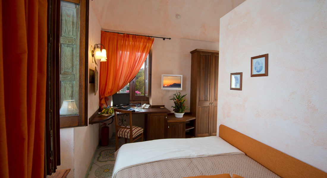 Denise Camera Economy Antico Borgo dei Limoni è una luminosa camera doppia o uso singola, con entrata indipendente dai giardini e due finestre da cui spazia una meravigliosa veduta sul mare e vista giardini.